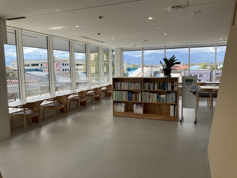 ここは、議員や職員だけではなく一般の方にも利用していただけるスペースとして開放しています。遥か遠くにそびえる日高山脈を見ながら、仕事や打合せ等ができる役場庁舎のおススメなスポットです。