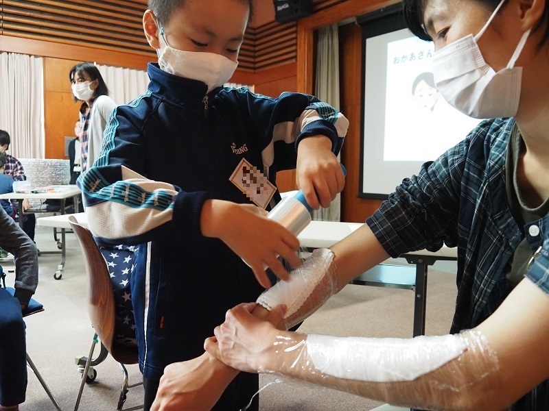 当日は4組11人の小学生親子が参加し、身近なグッズを使ったケガの応急処置方法、自宅から避難所までのルートの確認、家の中でモノが倒れてくる危険な場所はないか、段ボールベットの組み立て方法等、親子で真剣に話し合う場面が見られました。