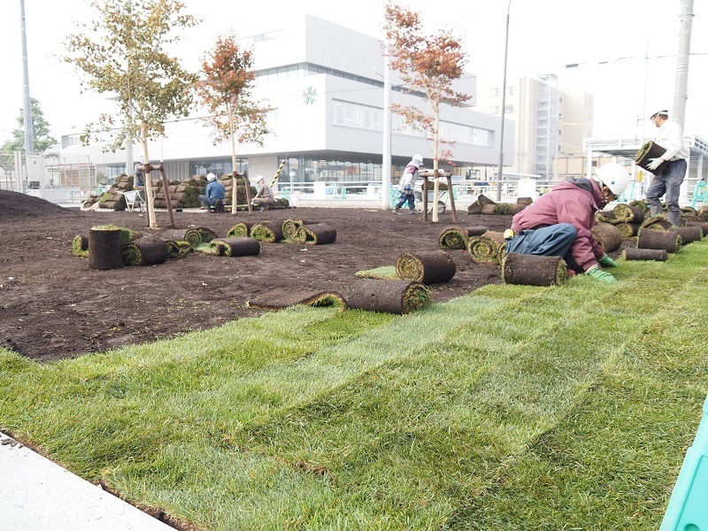 早朝から8人ほどの作業員の方が、この緑のスペースを作るための芝張り作業を開始されていました。海苔巻きのように積み上げられた芝ロール。ざっと見たところ、その数約500ロール。これを丁寧に一枚一枚、午前中いっぱいかけて仕上げていくそうです。
