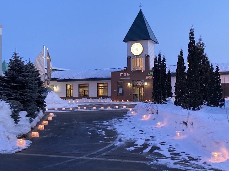 夜5時の一斉点灯時間には町内のあちこちでアイスキャンドルの優しい光が灯り、なんとも素敵な雰囲気に包まれた芽室町。