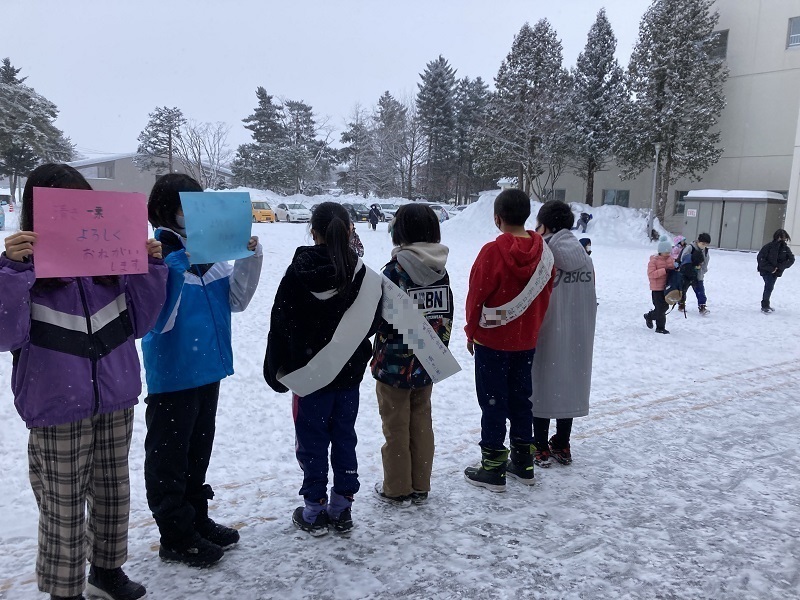 肩から斜めにかけたタスキには、色とりどりのマジックで、候補者の名前とメッセージが書かれてあり、雪の降るなか、登校してくる児童たちに向けて、一生懸命呼びかけていました。