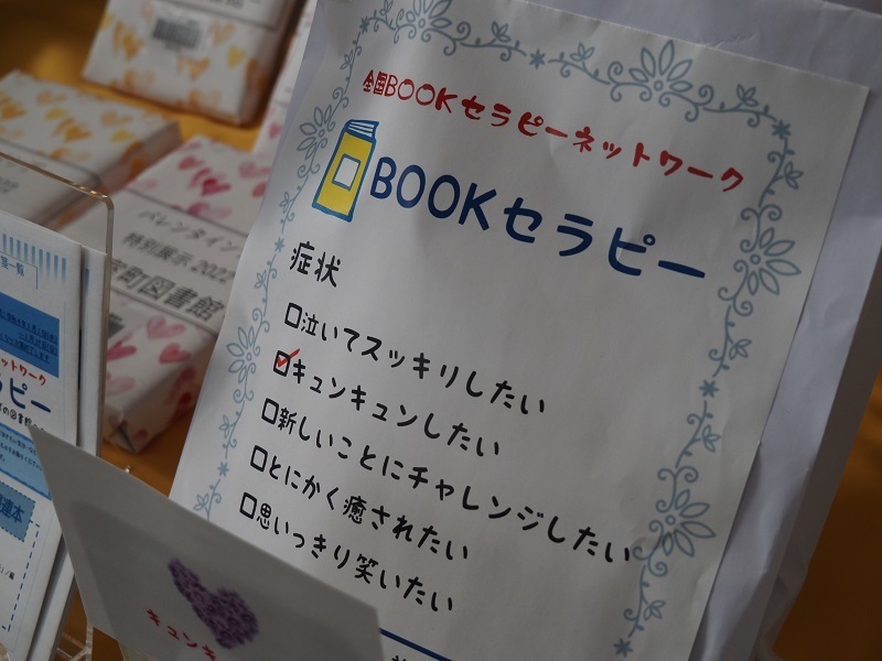 図書館では、Bookセラピーとバレンタイン特別展示の2つの企画を実施中です。