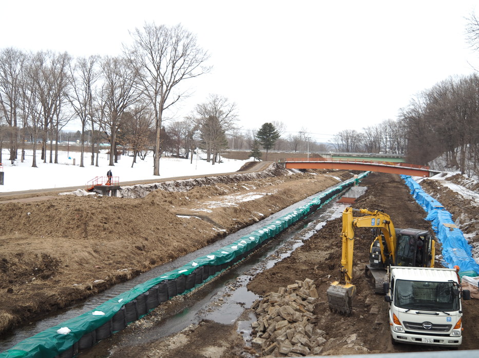 今日は西3条8丁目付近からピウカ川を撮影した一枚です。現在、こちらでは河川改修が行われています。河道を掘削し流下断面を拡大することで、水がより安全に流れるような川になる予定です。
