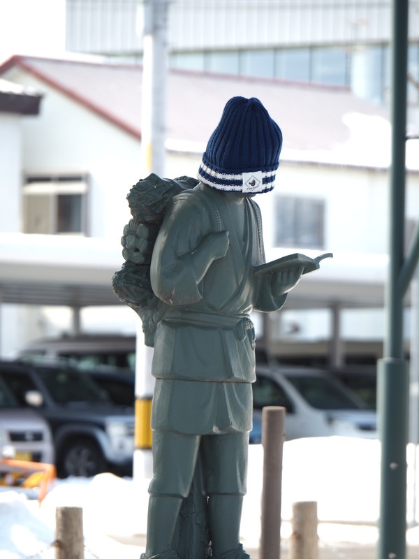 今日は公民館駐車場で撮影した一枚です。どなたか親切な方が見繕って下さったのか、二宮尊徳(金次郎)像が温かそうな帽子を被っていました。こちらの像の台座に刻まれている「以徳報徳」という言葉は、モデルとなった二宮尊徳さんが重要視していた言葉で「良いこと(嬉しいこと)をしてもらったら、それを相手の人に返していく」という思想のようです。まさにこの場面にぴったりの言葉だなぁ、と思わず感心してしまいました。