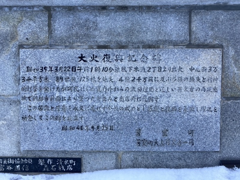 めむろーど駐車場の一角に、この災害の歴史を風化させず後世に語り継ぐため、復興記念モニュメントが建立されています。