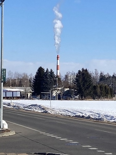 今日は、町内にある製糖工場の煙突から出る真っ白い煙が、まっすぐ上に向けて立ち上っている一枚です。