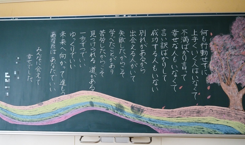それぞれの教室の黒板には、先生から新しい出発に向けた心温まるメッセージも。思い出に残る卒業式となったことでしょうね。