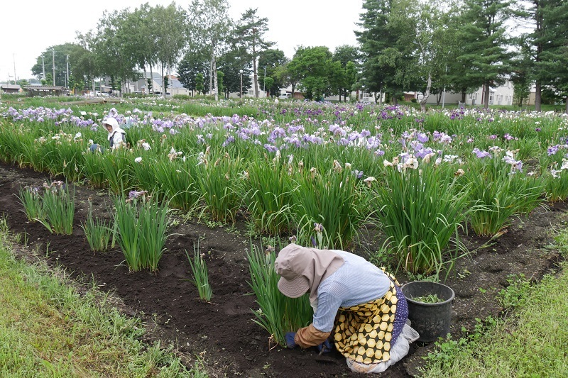 7月16日から3日間かけて開催される「イリス・フェスタinめむろ」に向けて、最終的な花の手入れが行われていました。約2.1haの広さの敷地に咲く約1万株の花菖蒲。ひとつひとつ手作業でのお手入れは本当に頭が下がります。