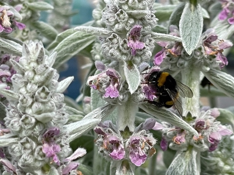 こちらホームページの画像は、花(ラムズイヤー)と蜂です。この花にだけたくさんの蜂が集まってきていました。おいしいのでしょうか。