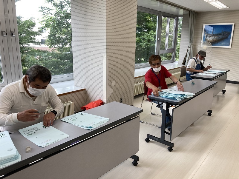 今回も、障がいを持った方たちの職場実習の場として、封筒へのスタンプ押し、封詰め、のり付け等、発送までの一連の作業を、ひとつひとつ丁寧に手伝っていただきました。最初のころは、静かに次の指示を待っている様子が多かった人たちも、最近は、積極的に声を出して、自ら次の作業に取りかかったり、まだ終了していない隣の人を助けている様子なども見られるようになりました。