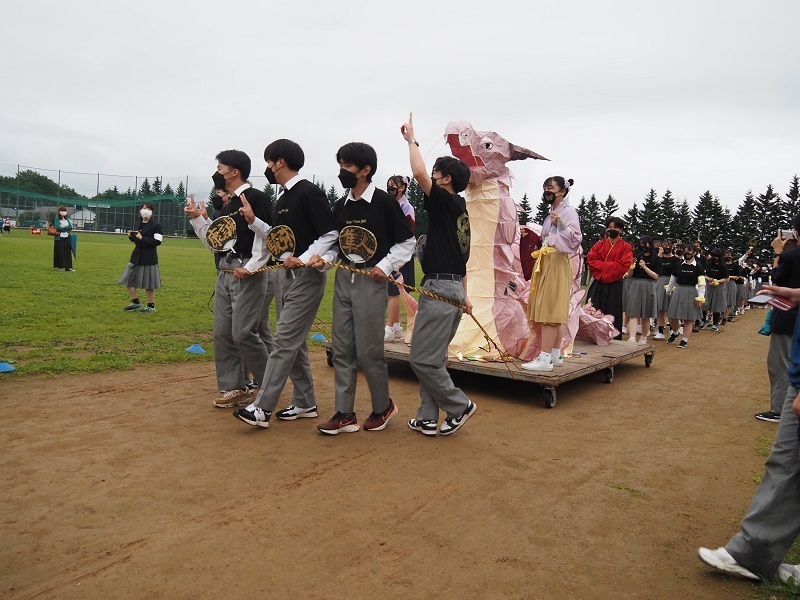 本日の写真は、芽室高校の学校祭での「行灯パレード」の様子のひとコマです。以前は、芽室町の街なかを、芽高生たちが練り歩くスタイルで行われていたパレードですが、今年はコロナの影響を考慮し一般公開はしない形で学校のグラウンドを使ってのスタイルで開催。約2週間かけて作り上げたという見事な行灯をゆっくりと引っ張りながら、総勢445名の生徒たちのパレードは迫力満点。