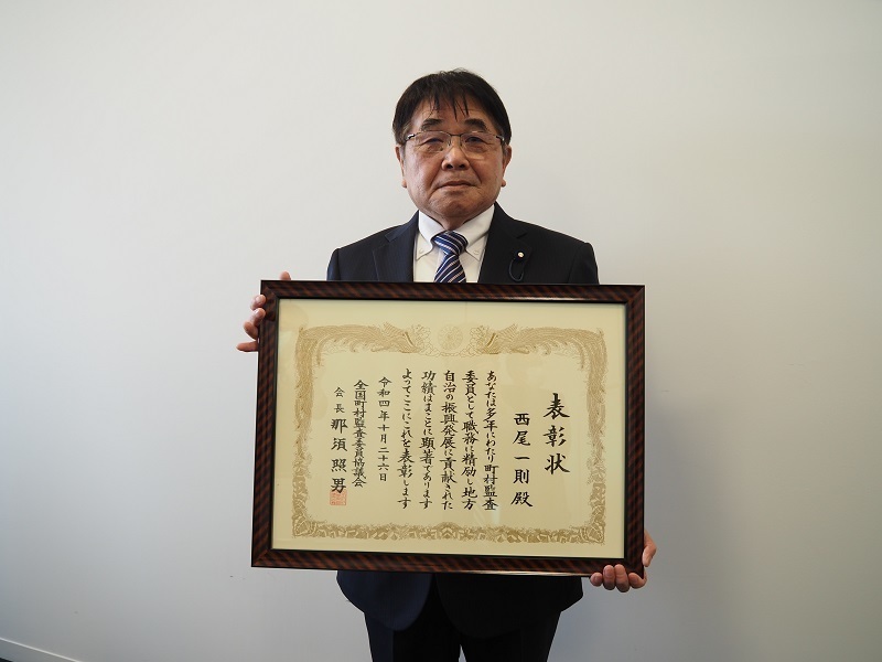芽室町監査委員の西尾一則さんが、このほど、全国町村監査委員協議会から多年にわたる功労に対して表彰されました。