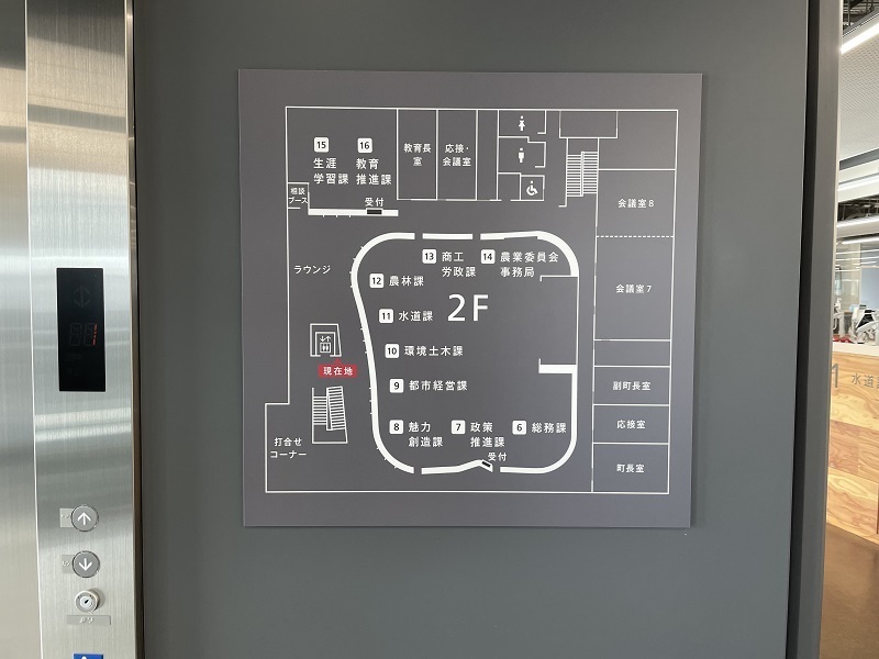 この例だと「2階の6番窓口にお越しください」ということを表しています。6番というのは、写真にあるキューブ上の表示番号で、庁舎に掲示している案内図にも同じ番号が載っています。