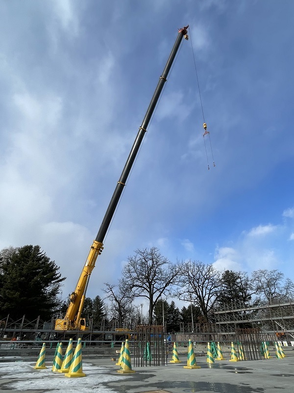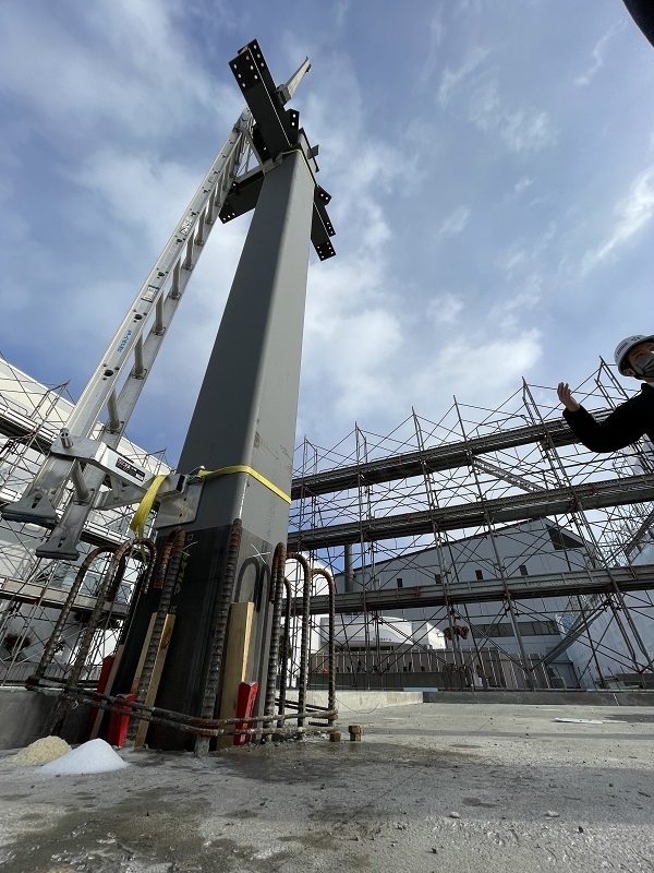 新プールの工事は、基礎工事が完了し、今回の立柱式を経て鉄骨建方へと進んでいきます。