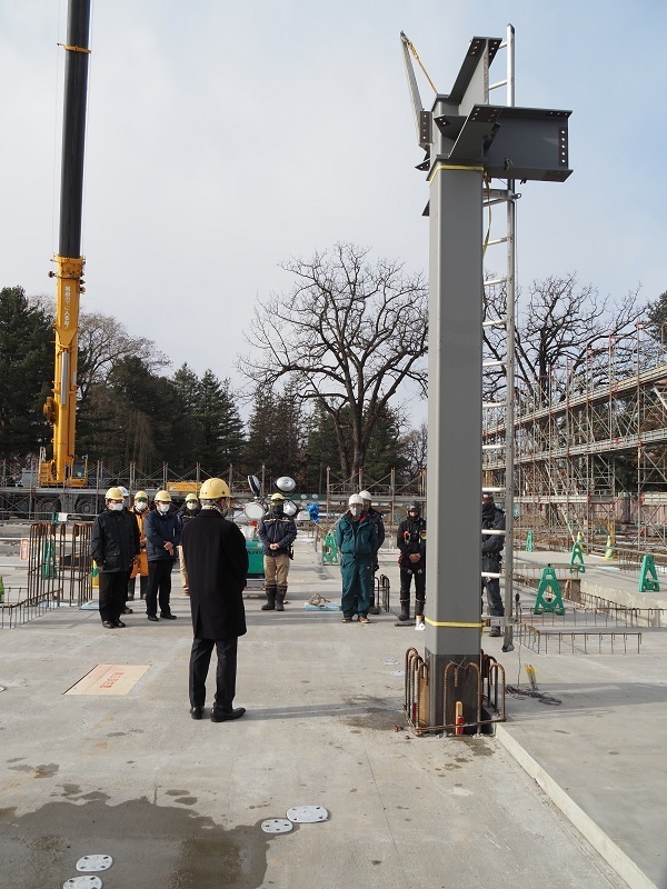 立柱式とは、鉄骨造の建造物で一番初めの柱を立てる際に執り行われ、現場に携わる皆さんの安全を願って行われるそうです。