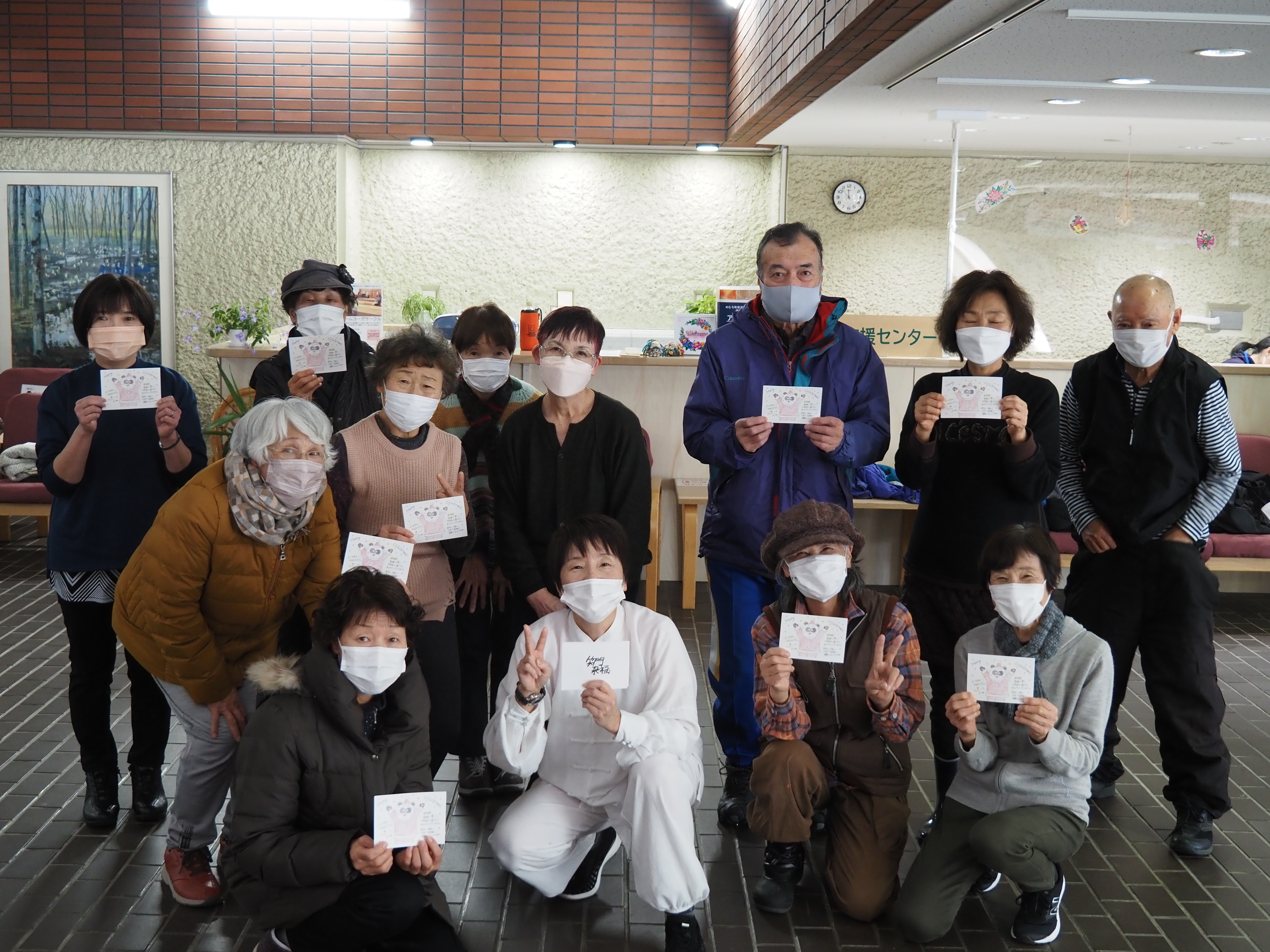 今日は公民館1階ロビーで撮影した写真です。今日は毎週火・木曜日にここで行われているピンピン体操火曜日クラスの年内最終日でした。講師の河南さんからは手作りのクリスマスカードが配られ、参加者の皆さんも「また来年!」と笑顔で解散していきました。