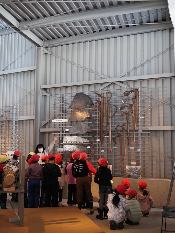 今日はふるさと歴史館で撮影した写真です。今日は芽室小学校の3年生の皆さんが授業で来館していました。木を切るための大きなノコギリや地下から水を汲み上げる滑車など、歴史館職員の方の解説を真剣に聞いていました。