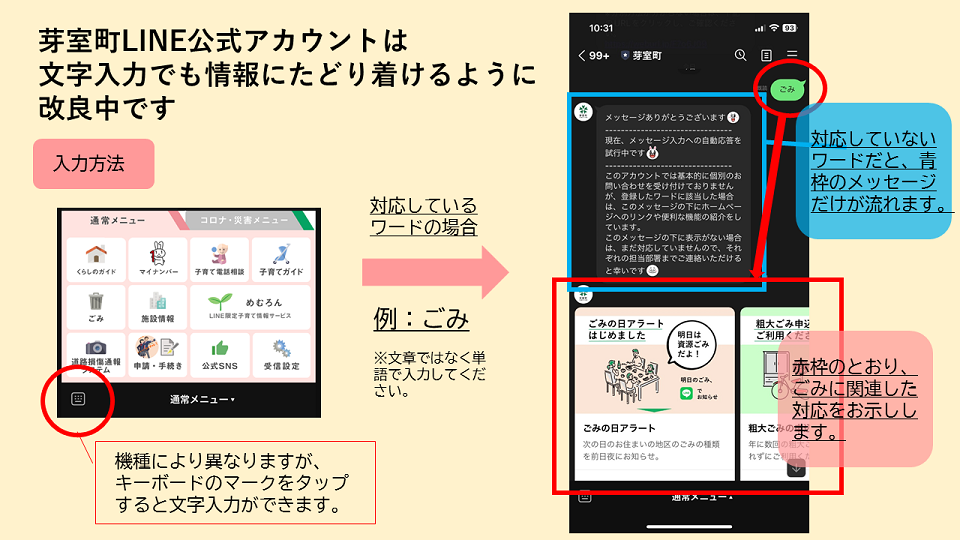 例えば「ごみと入力すると、ごみに関するメニューが表示される」「新嵐山と入力すると新嵐山スカイパークのホームページへのリンクを表示する」などです。
