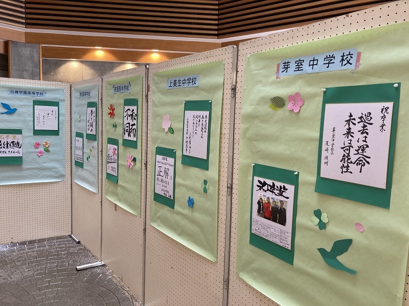まず1つ目。3月はお別れ&卒業のシーズン。町内の小中高校の学校長と担任の先生たちからの卒業生に向けたメッセージ色紙がずらり。これから新しい道を踏み出すの子どもたちの背中をそっと押してくれる言葉が並べられています。