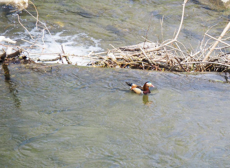 今日は南方面のピウカ川で撮影した写真です。見慣れない色の鳥が目に入ったので、思わずシャッターを切りました。警戒心が強く逃げられてしまいましたが、赤っぽいクチバシとカモのような挙動から、オシドリと思われます。オシドリのオスは繁殖期のみ美しい色彩に変化し、メスとツガイで行動することが多いといわれています。2枚目に一緒に写っているのは奥さんでしょうか。