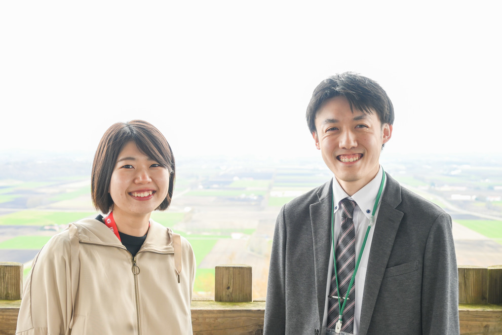 今日は新嵐山展望台で撮影した写真です。お二人は芽室町に職員派遣で来られた方で、写真左の女性が魅力創造課魅力創造係の髙橋 みきさん、右が教育推進課教育推進係の向山 英吾(むかいやま えいご)さんです。