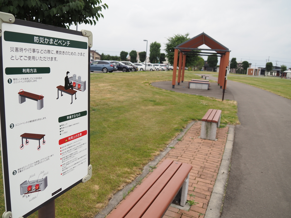 あいあい公園は防災公園としての機能があり、災害等があった際には、ベンチがかまどになったり、あずまやがテントになったりと、防災拠点としての役割をもっています。