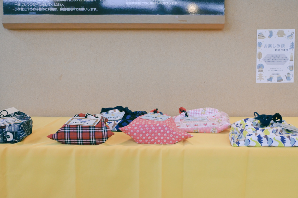 今日は図書館で撮影した写真です。現在、図書館では「お楽しみ袋」が始まっています。中身は開けてのお楽しみ、タグのテーマに沿った本が3冊入っているそうです。
