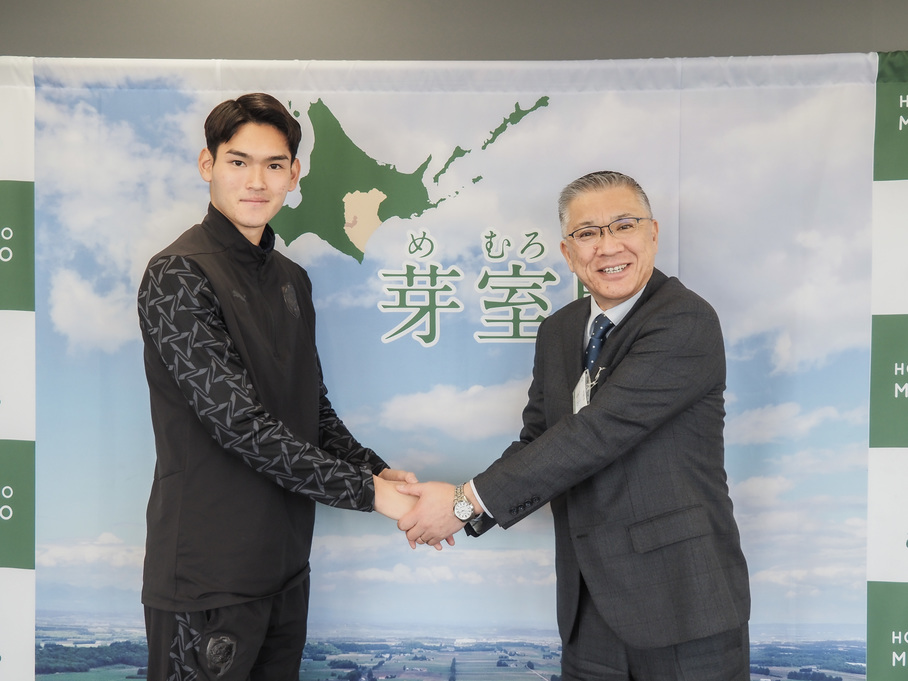 今日は、プロサッカー選手としてJ2清水エスパルスに所属する阿部 諒弥さんが来庁されました。阿部さんは芽室町出身で、芽室サッカー少年団のころからGKとして活躍。帯広北高校→中央学院大学に進学し、2023シーズンに清水エスパルスに加入しました。