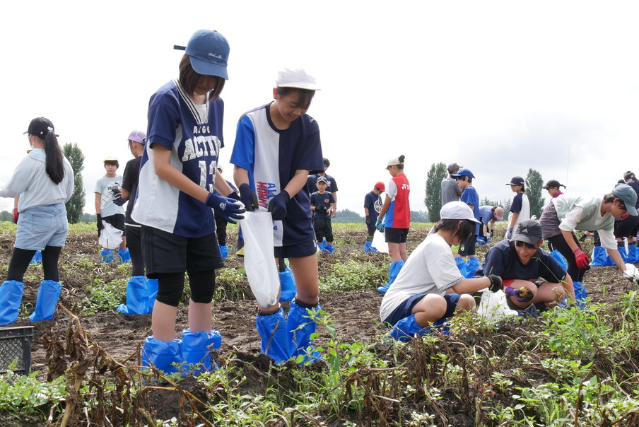 今日は、食農教育「がぶりのじかん」が行われ、美生にある農場で芽室小学校と芽室西小学校の6年生約160人がじゃがいもの収穫体験をしました。