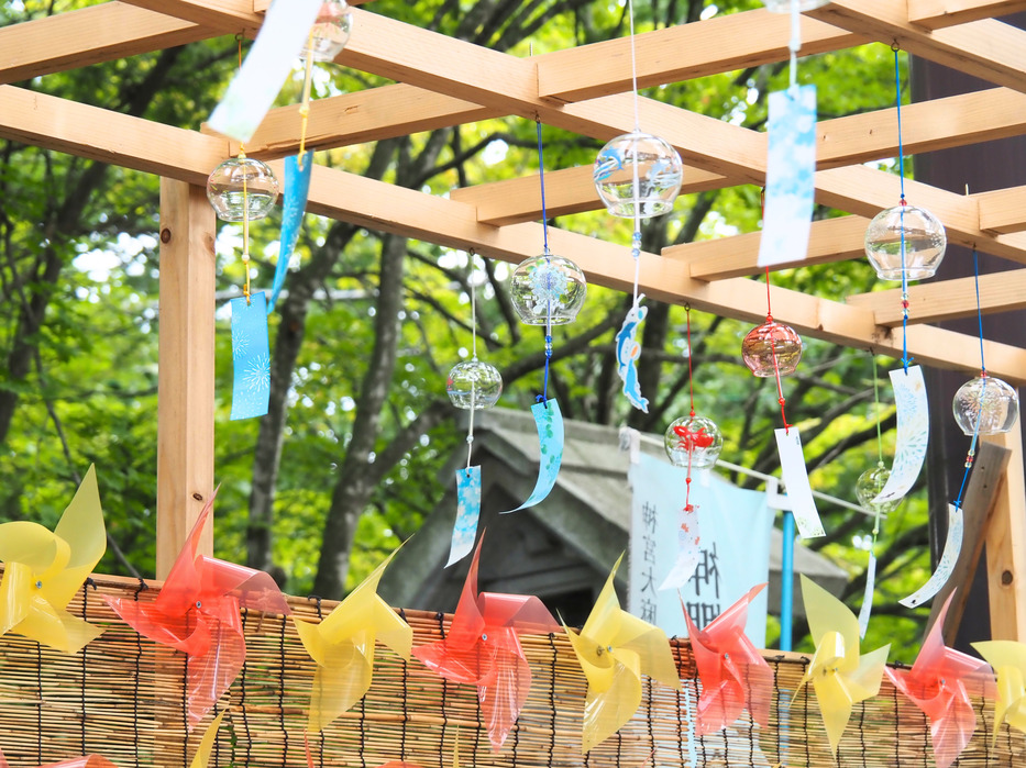 風鈴や風車が色鮮やかに飾り付けられていて、花手水もきれいでした。
