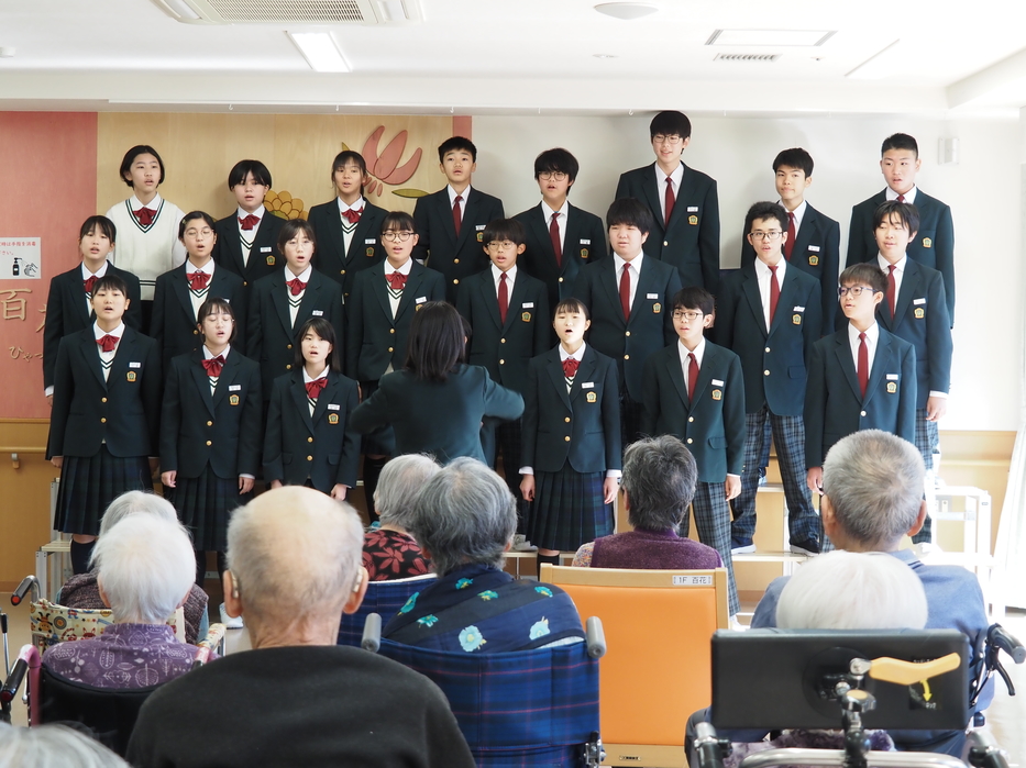 2年生の異年齢交流として2クラスが同施設に訪問し、10月上旬に行われた文化祭で歌った合唱曲を披露。その後は、あらかじめ考えてきた質問をもとに入所者の皆さんと交流を深めました。