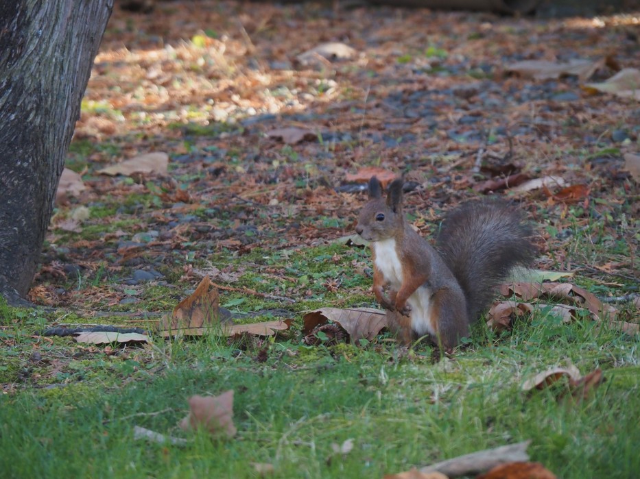 餌を集めているのか、落ち葉のすきまをごそごそしていました。こちらの気配を察したら少し移動してごそごそ。これから冬に向けて一生懸命食料を蓄えるリスの姿を見かけることも増えそうです。