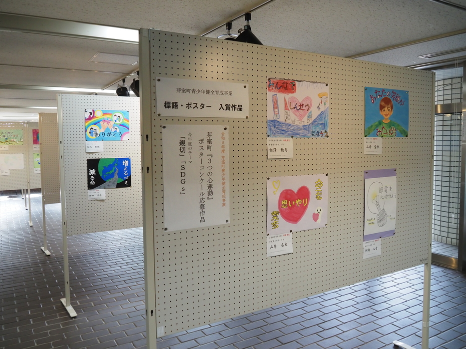 「親切」と「SDGs」をテーマに、町内の小中学生が描いたイラスト(ポスター)が貼られています。