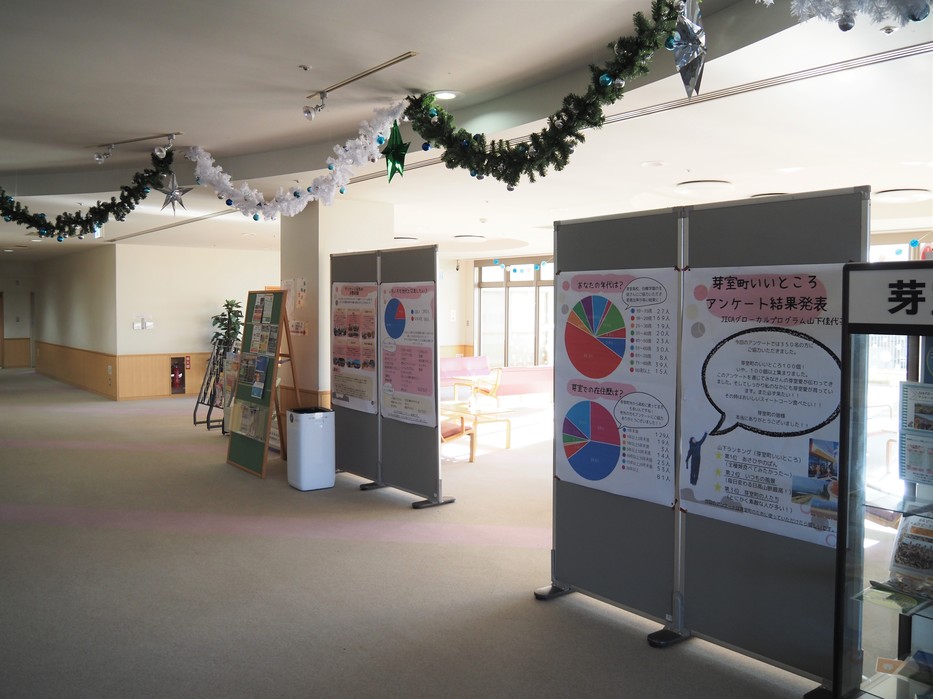10月から12月中旬まで海外派遣前の実習で芽室町に滞在していた、JICA海外協力隊実習生による「芽室町いいところ」アンケートの結果が展示されています。
