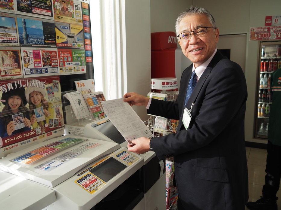 スタートに当たり、手島町長がセブンイレブン東4条2丁目店でコンビニ交付を体験。