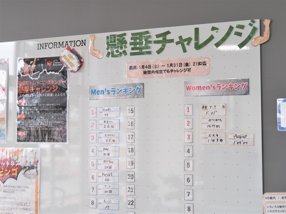 施設内のホワイトボードに「懸垂チャレンジ」の文字を発見しました。