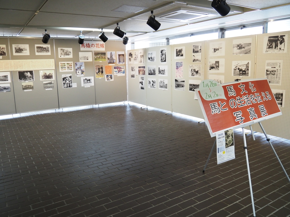 芽室町中央公民館1階ロビーでは、現在、馬文化・馬との生活を伝える写真展示が行われています。