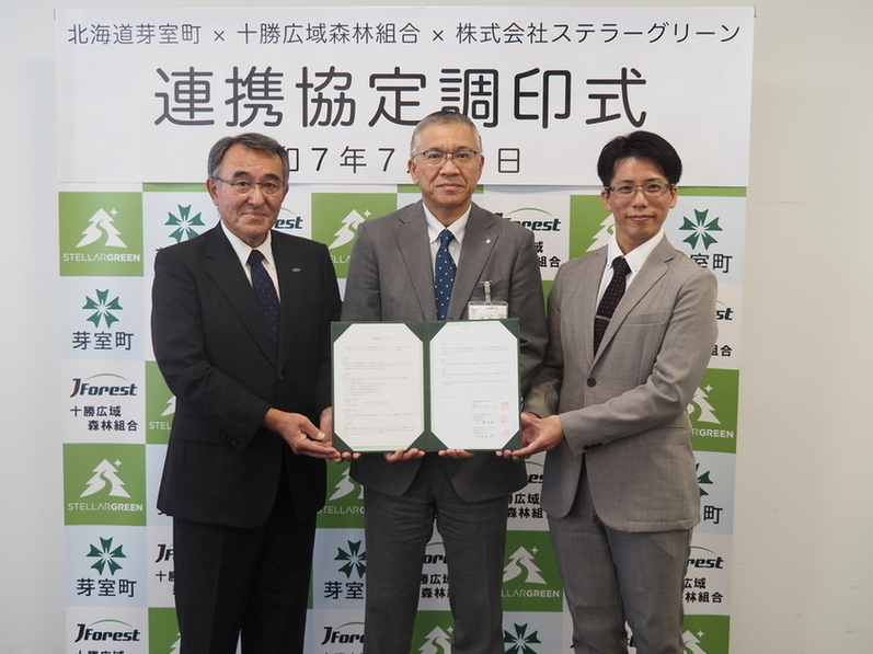 芽室町と十勝広域森林組合と株式会社ステラーグリーンは、2025年7月31日(木)に「ゼロカーボンの実現に向けた連携協定」を締結しました。