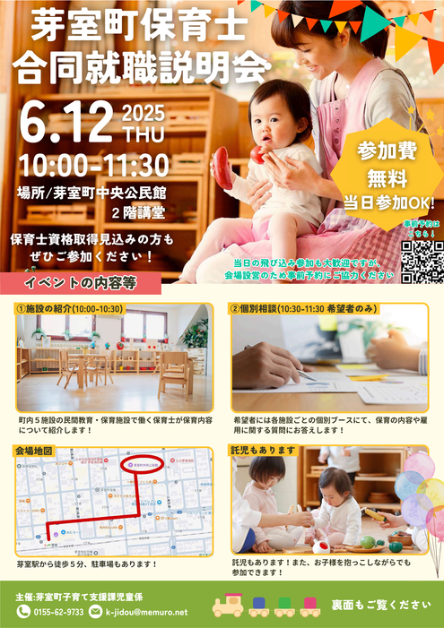 芽室町では、保育士・幼稚園教諭資格をお持ちの方、または取得見込みの方を対象に、町内の法人教育・保育施設の就職説明会を実施しています。(令和7年度:6月12日(木)、令和6年度:8月17日(土)、令和5年度:9月20日(水))