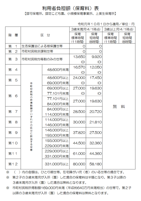なお、令和元年10月より幼児教育・保育の無償化が開始され、3歳児~5歳児クラスの保育料は無償となります。