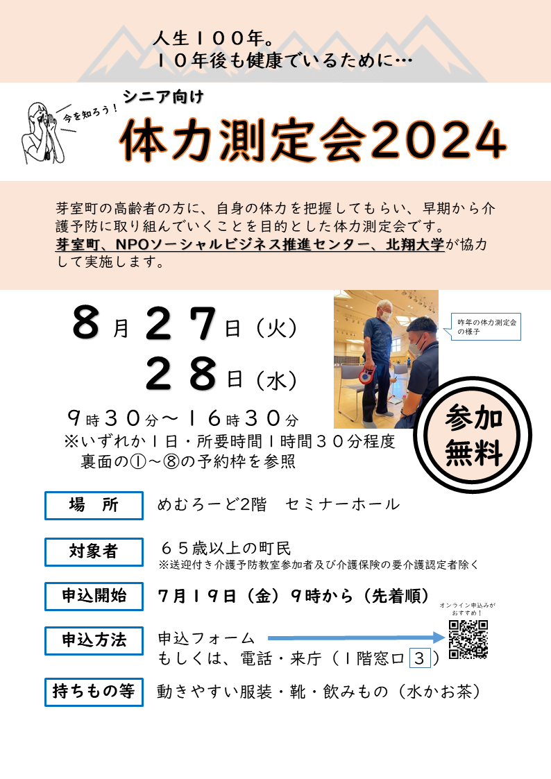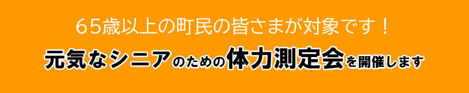いつまでも元気にこの町で暮らすために、健康の第一歩として、まずは体力測定会で自分の体力を把握しましょう。