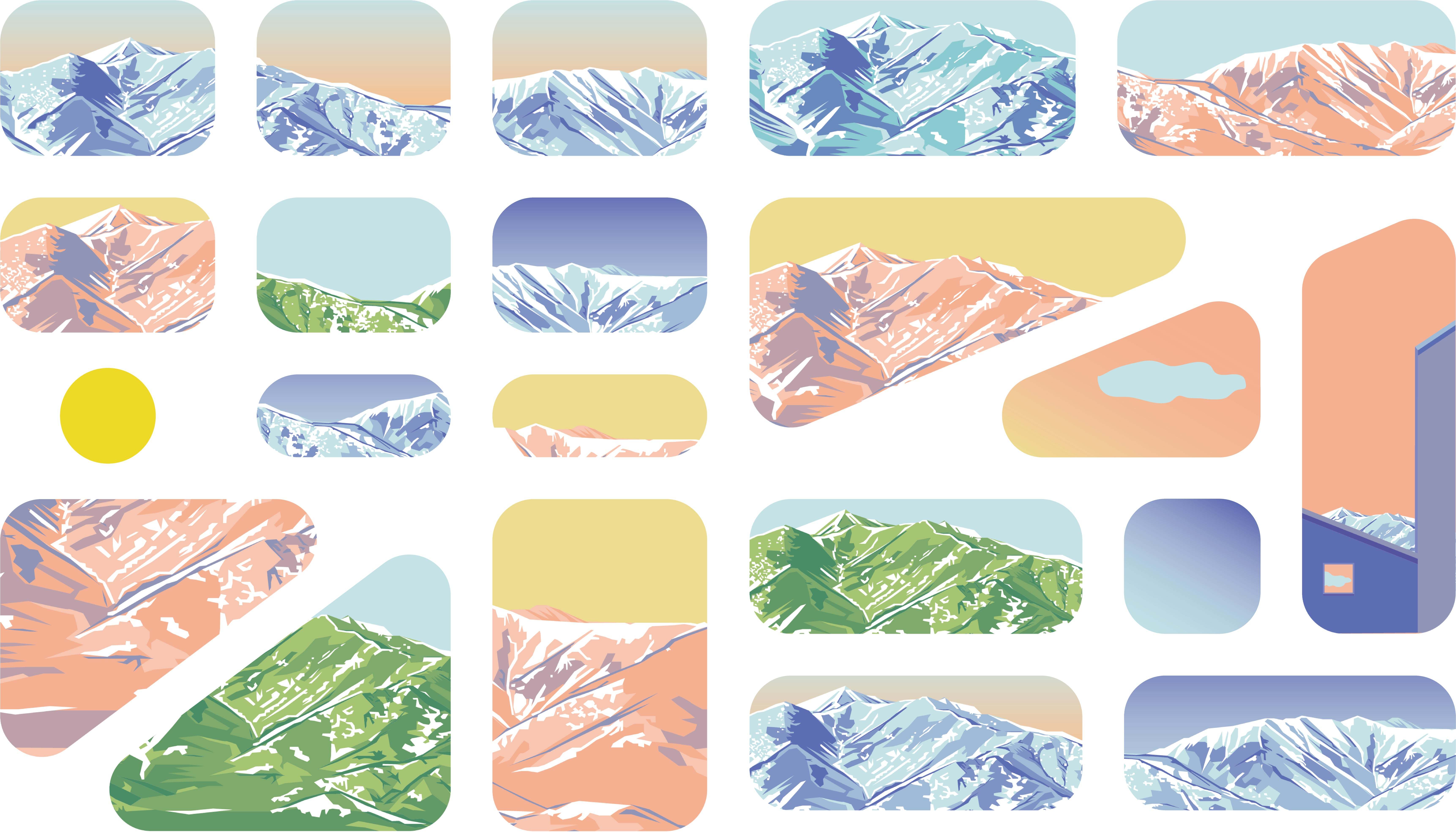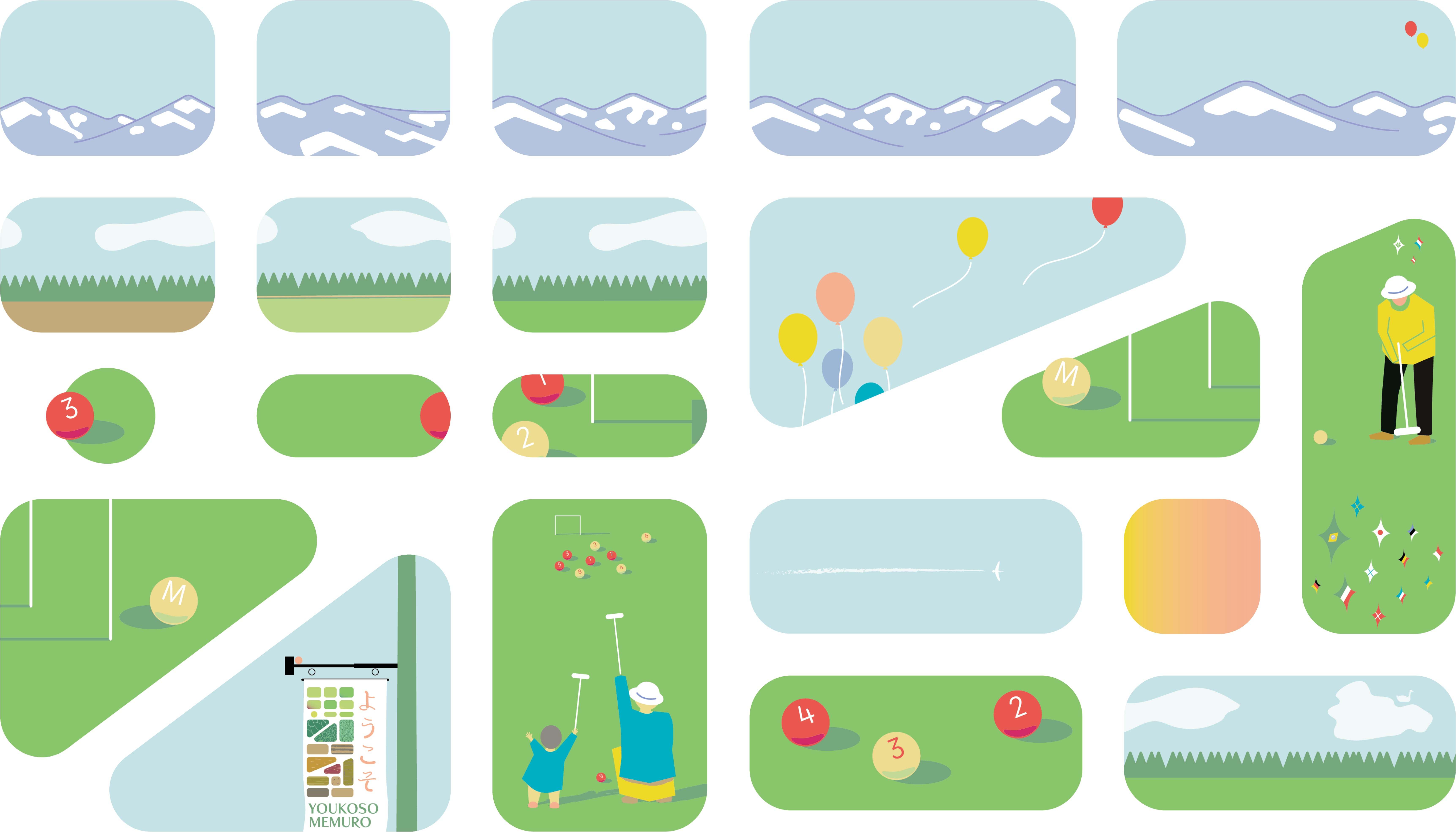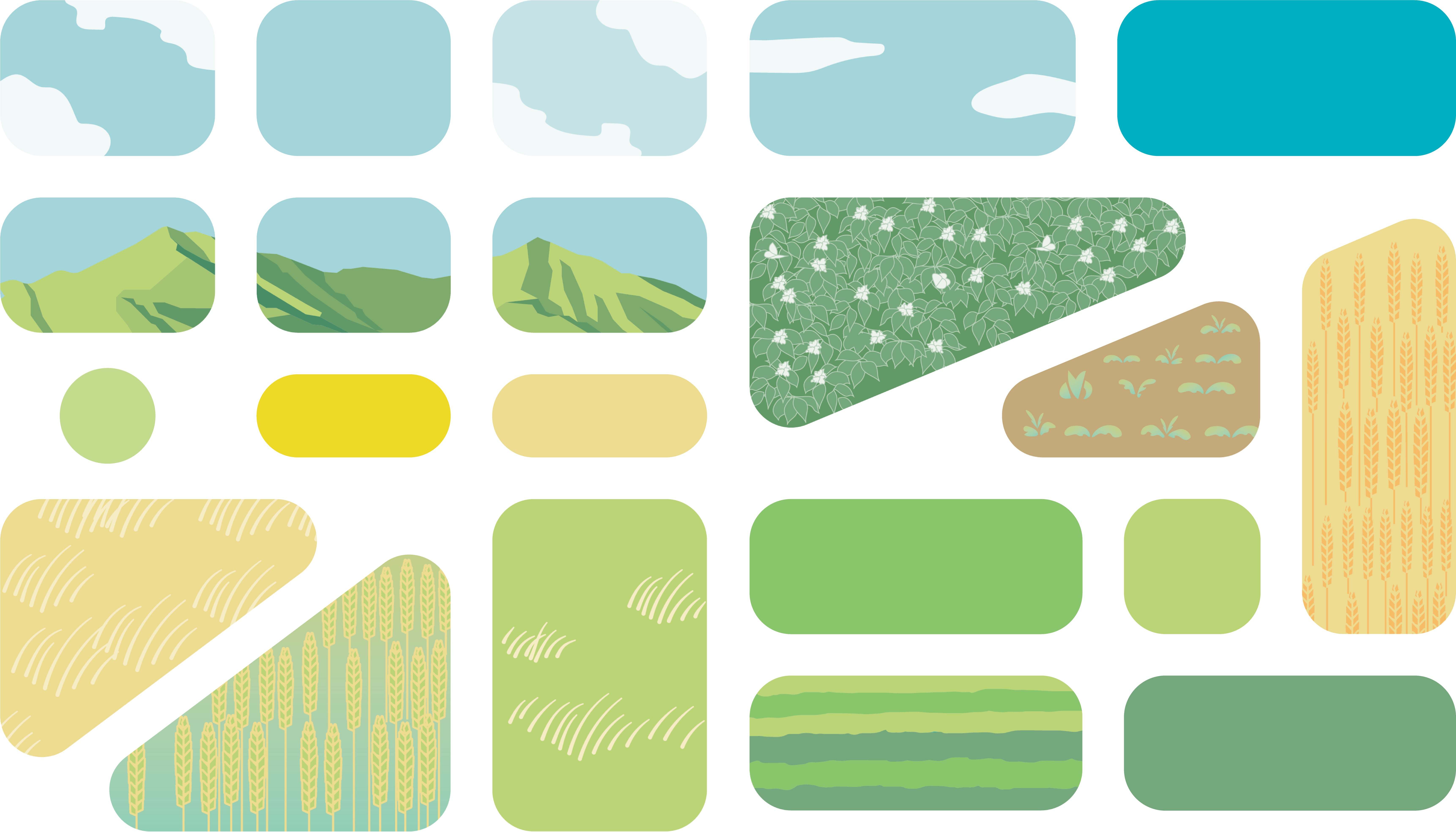 芽室町の「芽(室)」という漢字が浮かび上がるデザインとし、「芽ロゴ」と名付けました。最初に町でつくった「紙袋」は、農産物や畑、日高山脈の他、日本一の生産量を誇るスイートコーンなど町の魅力を表すイラストが描かれた図形の組み合わせで、「梱包テープ」は日高山脈をモチーフにしました。