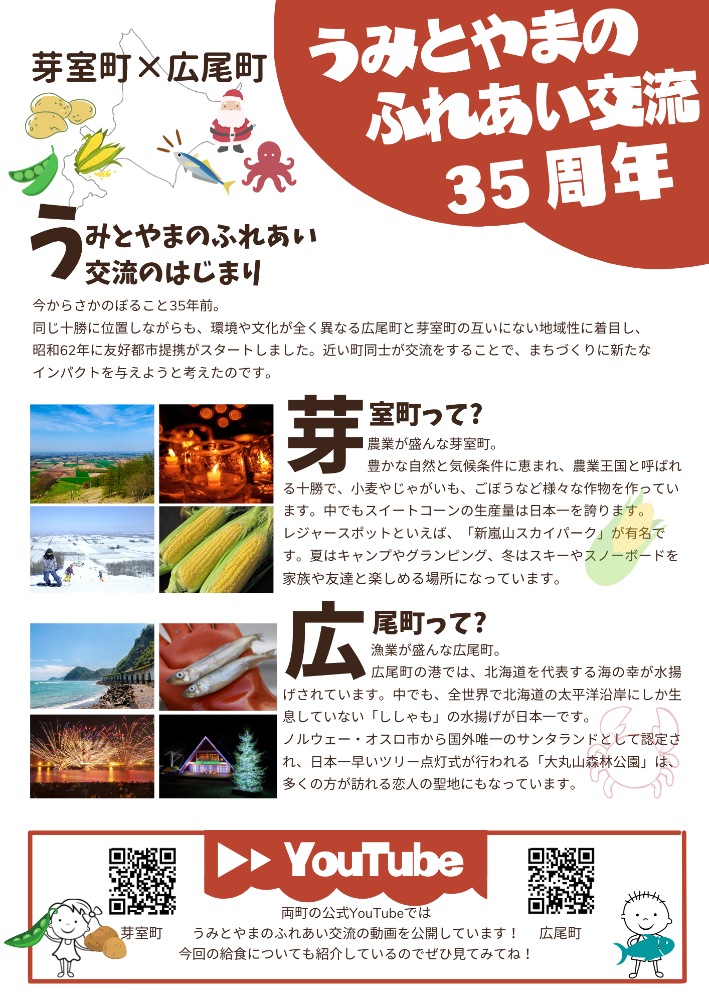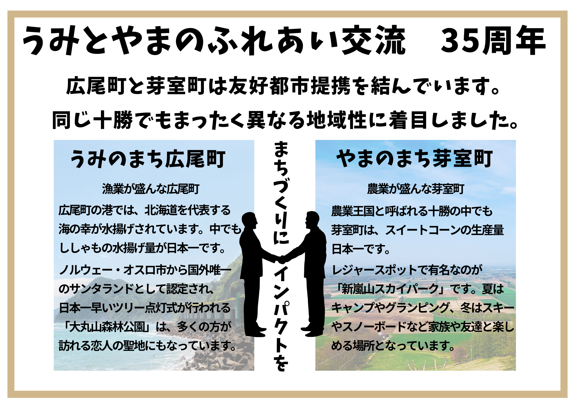 漁業を中心とする「うみのまち」広尾町と、農業を中心とする「やまのまち」芽室町は、お互いの町の交流による活性化を願い、昭和62年7月26日に「ふれあい宣言」を行い、毎年両町による物販交流などを通じて、友好親善を行っています。