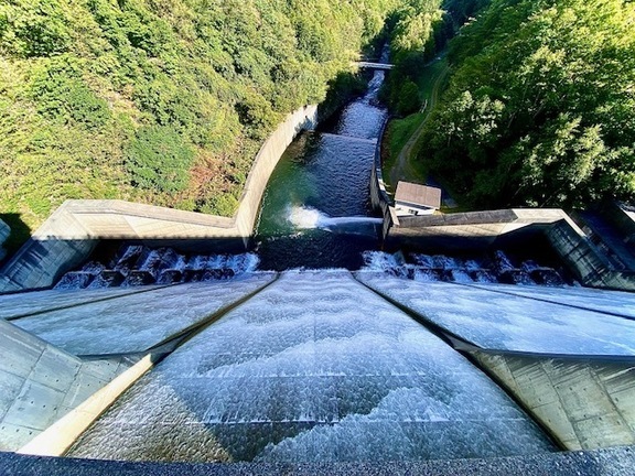 ダム形式は、ダムサイトの位置、地質構成、構造による経済性を総合的に検討されてコンバイン【複合】ダムとなりました。また、ダム本体の材料には、原石山を設けずに堤体基礎掘削材や購入骨材を使用し、周辺環境の改変が少なくなるよう建設されました。