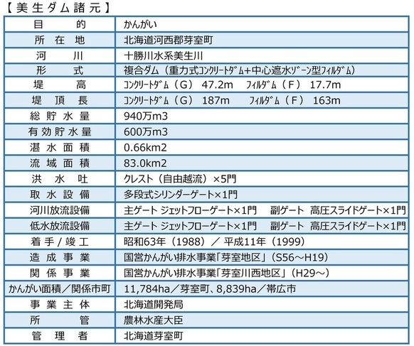 国営かんがい排水事業「芽室地区」のかんがい用水の水源として、河西郡芽室町の十勝川水系美生川に北海道開発局が事業主体で造成した農業用利水ダムです。洪水調節機能はなく4類ダムであり、ダム湖が満水位において豊富な流入量の時は、洪水吐から自然越流しています。