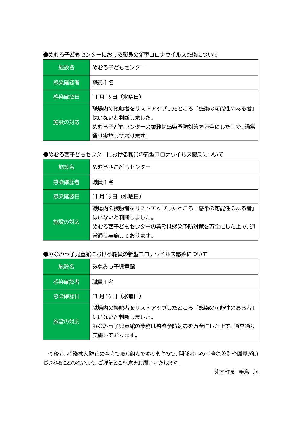 めむろ子どもセンター、めむろ西こどもセンター、みなみっ子児童館、公立芽室病院における職員の新型コロナウイルス感染について
