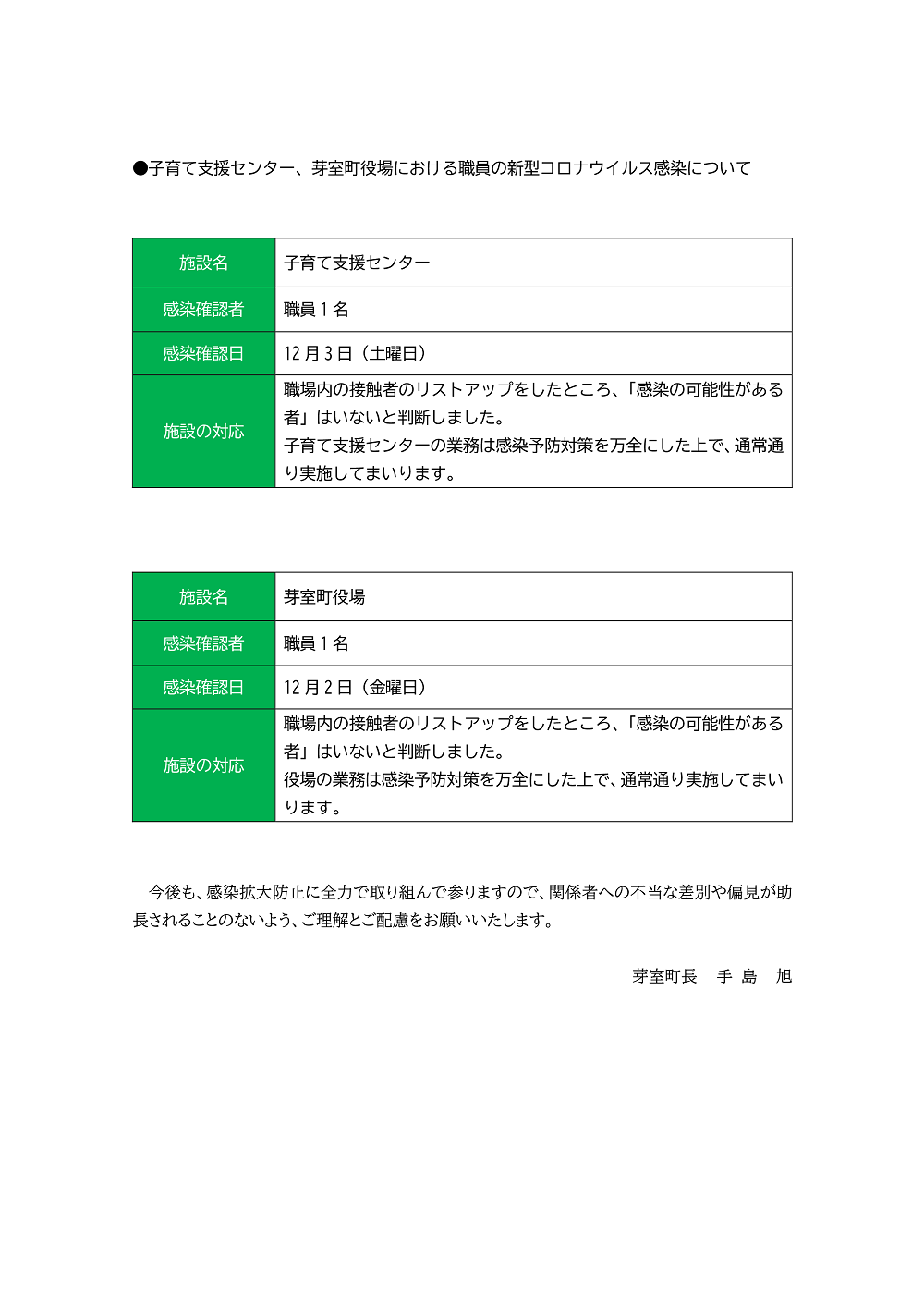 芽室町役場、子育て支援センターにおける職員の新型コロナウイルス感染について