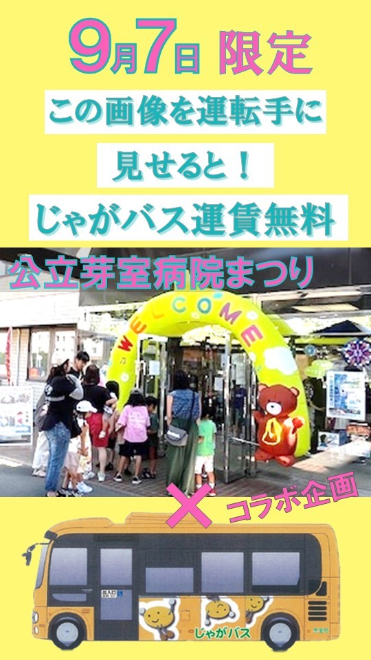公立芽室病院まつりのチラシを持参のうえ、イベント来場時及び帰宅時のじゃがバス降車時に運転手へご提示ください。