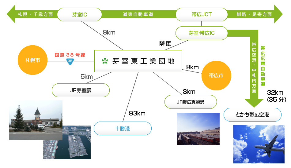 さらに、工業団地から帯広広尾自動車道を経て、とかち帯広空港まで32km(35分)、道東自動車道で新千歳空港まで約2時間、「陸・海・空」のあらゆる交通網を完備し迅速な輸送機能が整備されています。